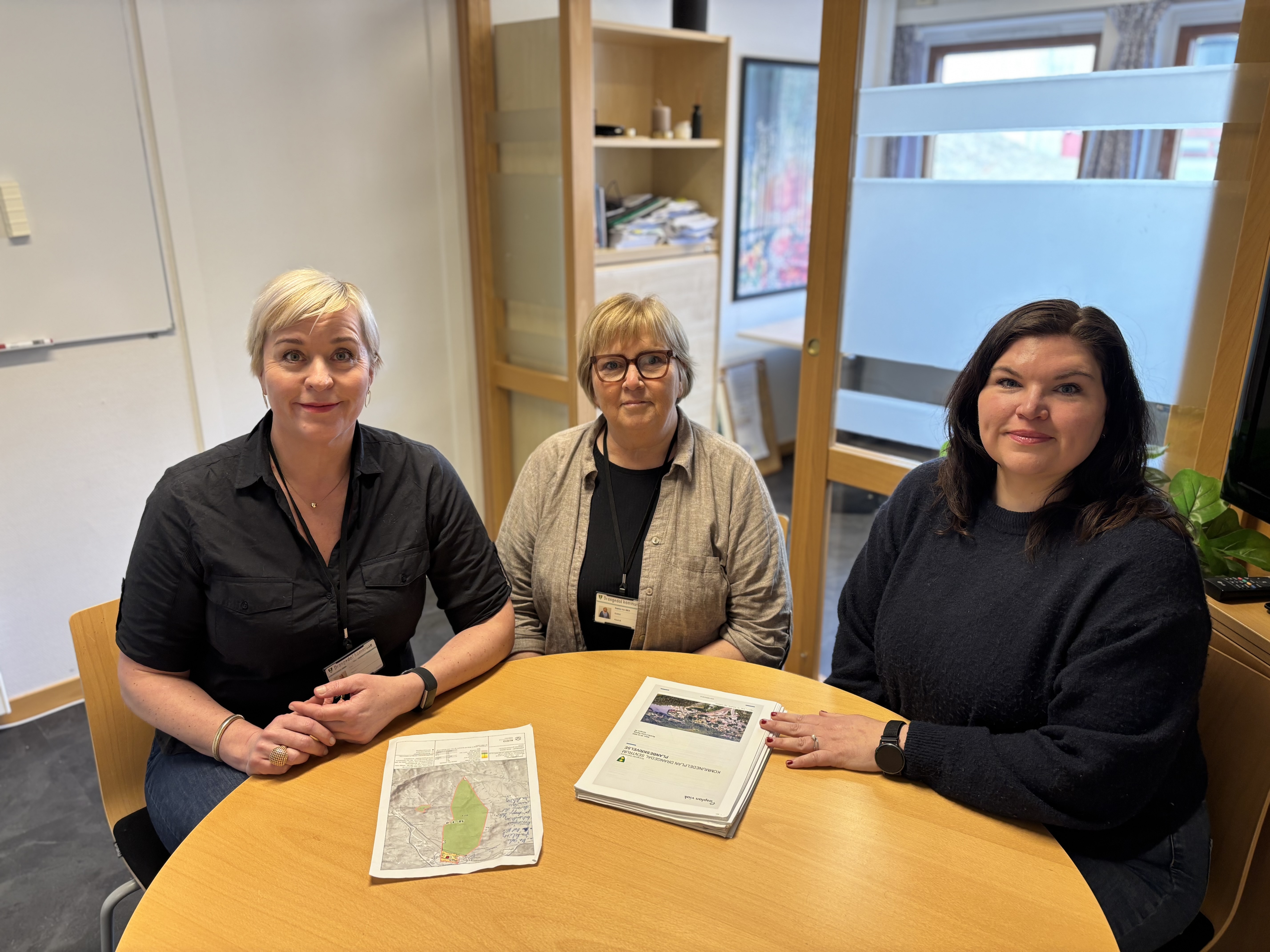 Fra venstre: Elisabeth Holte, avdelingsleder for plan, næring og utvikling, Solfrid Klodvik, arealplanlegger og Anette Thon Haugholt, byggesaksbehandler i Drangedal kommune